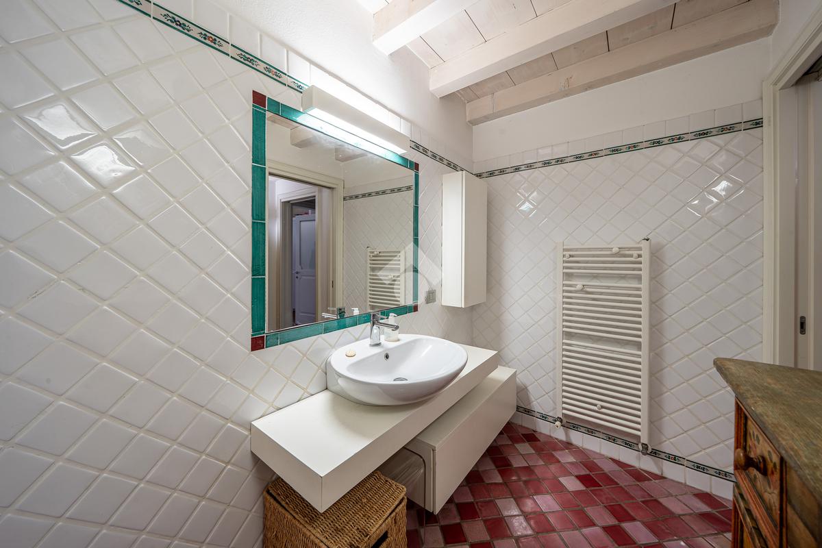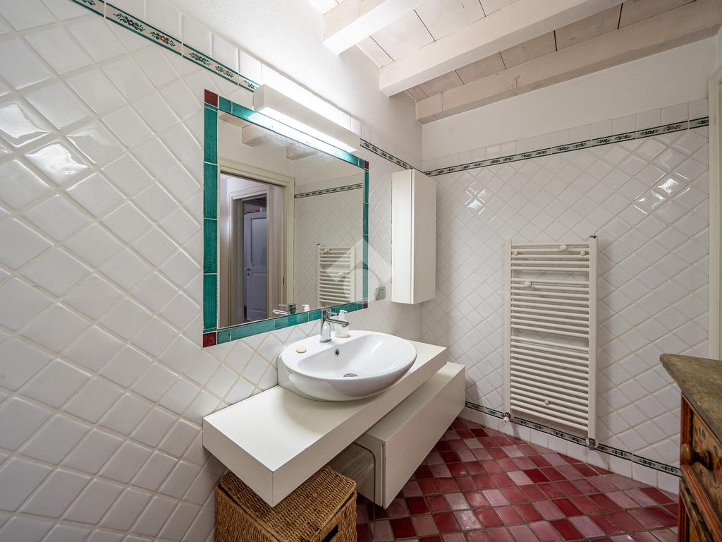 soffitti con travi a vista sbiancate, pavimenti in cotto artigianale nella zona giorno e legno naturale nelle camere, cucina su misura dal design contemporaneo, bagni in pietra naturale con sanitari sospesi e box doccia in cristallo, oltre a un’illuminazione progettata per esaltare volumi e materiali.